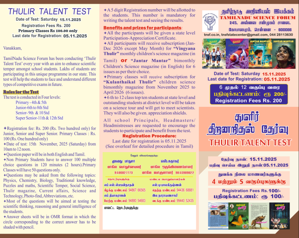 மாணவர்களிடையே அறிவியல் கண்ணோட்டத்தை அதிகப்படுத்தும் நோக்கில் தமிழ்நாடு அறிவியல் இயக்கம் தமிழில் ”துளிர்” இதழையும் ஆங்கிலத்தில் ஜந்தர் மந்தர் இதழையும் நடத்தி வருகிறது. கடந்த 25 வருடங்களுக்கும் மேலாக ஆண்டுதோறும் துளிர் திறனறிதல் தேர்வையும் நடத்திவருகிறது.