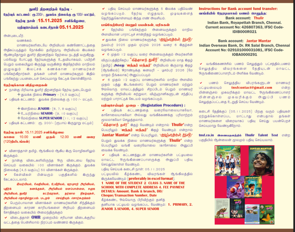 4,5 வகுப்பு பயிலும் துவக்க நிலை மாணவர்களுக்கும் இப்பொழுது இத்தேர்வு அறிமுகப்படுத்தப்பட்டுள்ளது.